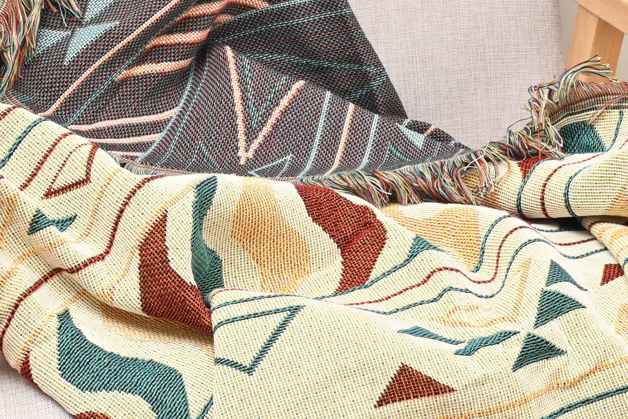 Reversible Geometric Pattern / Yarn dyed / Woven Jacquard style / Comfortable and breathable / Delicate fringe / Anti-pilling